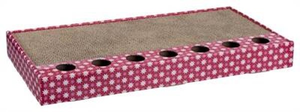 doos met samengeperst karton, aan de zijkant onder de gaatjes zitten 2 rinkelende speelballetjes verstopt! + extra zakje kattenkruid