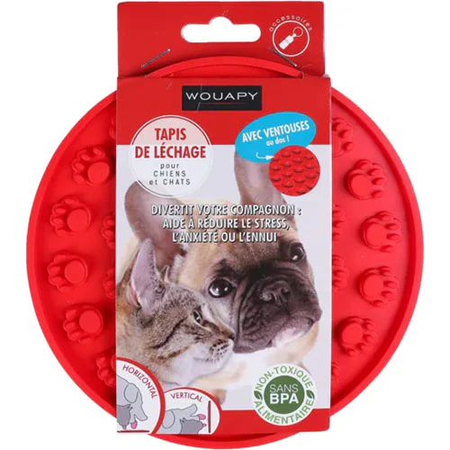 Le tapis à lécher permet de distraire votre animal lorsqu'il est seul, lorsque vous le lavez, lorsque vous le toilettez (par exemple en lui coupant les griffes, etc.), ou lorsqu'il est exposé à toute autre situation génératrice de stress. Mais le tapis à lécher empêche également les engloutissements.