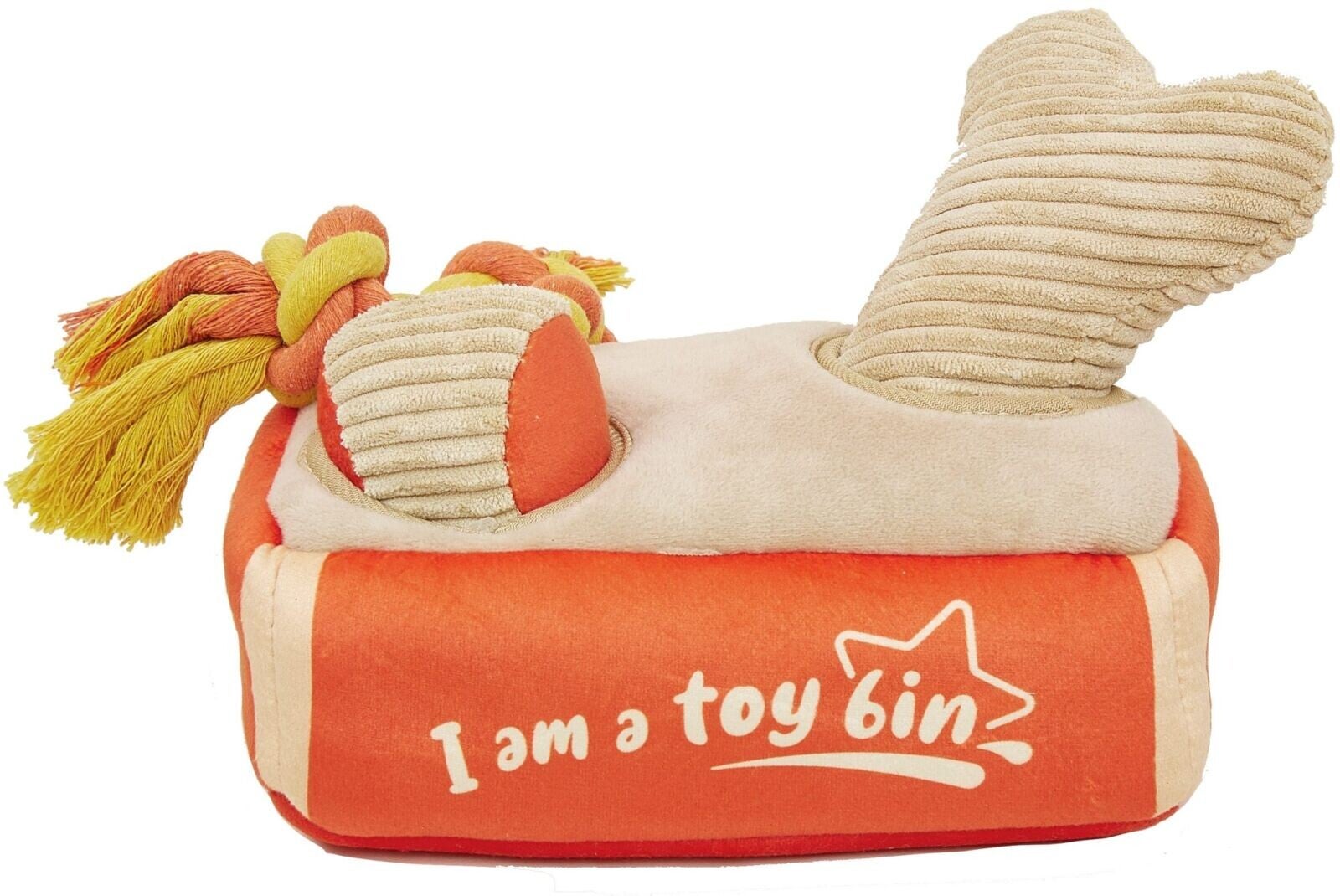 Er zijn vier verschillende onderdelen aan dit verstoppertje spel. Daag uw hond uit om het losse speelgoed te vinden door het flostouw, de bal en het bot te verstoppen in de pluche opbergbak.