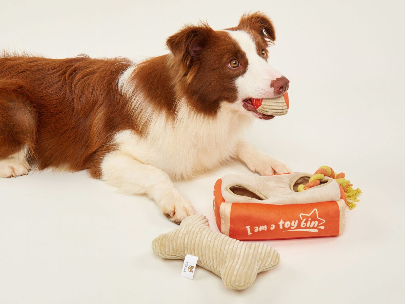 Il y a quatre parties différentes dans ce jeu de cache-cache. Mettez votre chien au défi de retrouver les jouets en vrac en cachant la corde dentaire, la balle et l'os dans la boîte de rangement en peluche.
