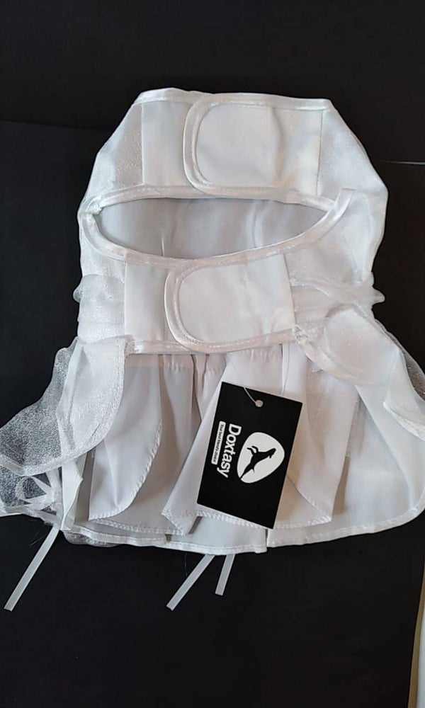 Polyester, dubbel gevoerd met voile en lintjes velcro sluiting aan hals en borst