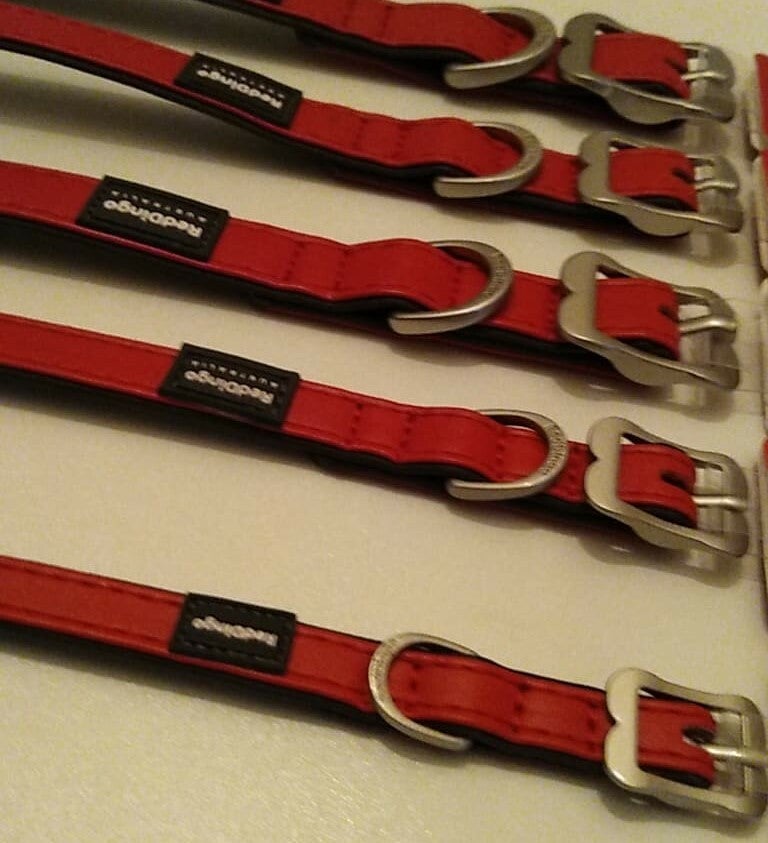 Verstelbare elegante halsbanden van hoogwaardig dierproefvrij kunstleer met een dubbellaagse voering voor extra vulling.