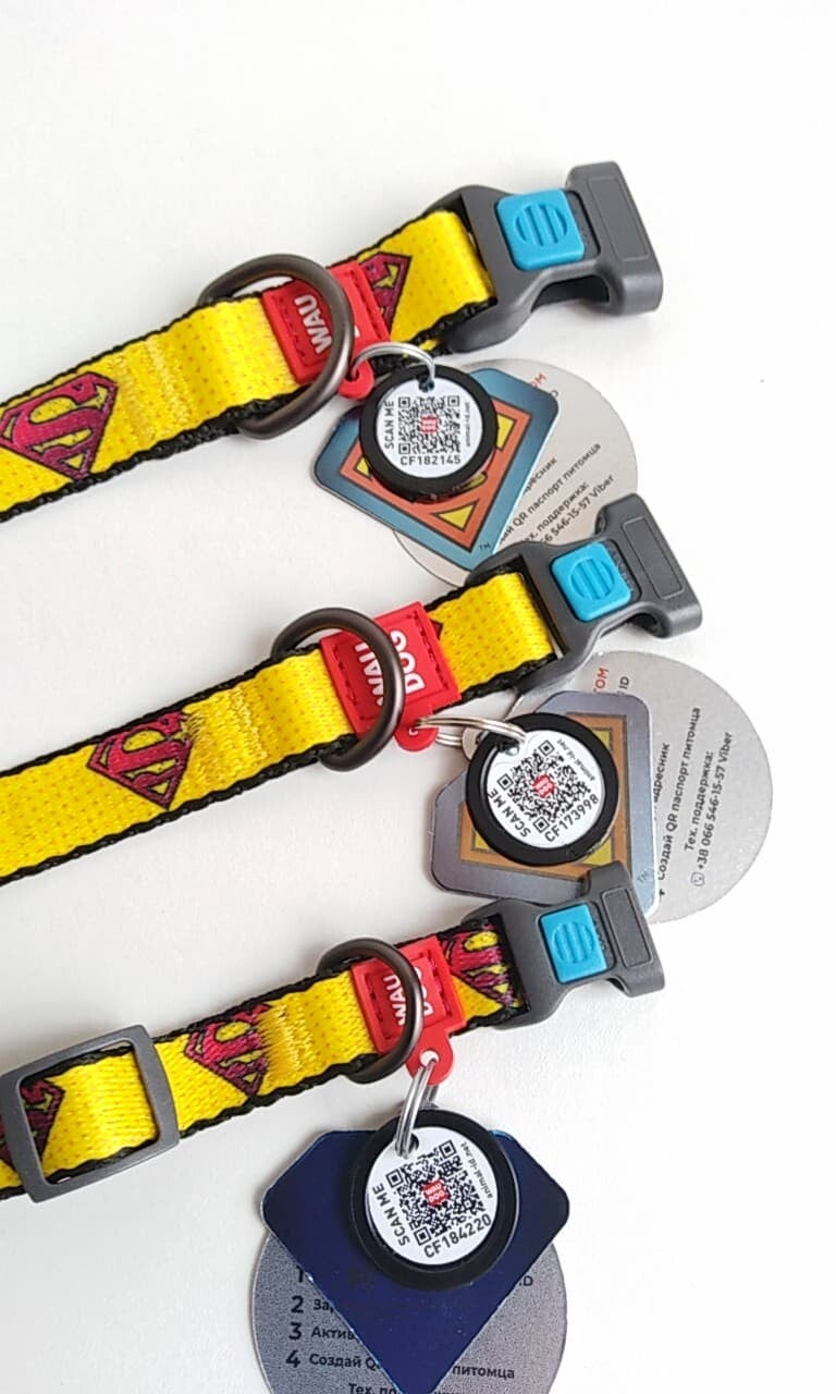 nylon brillant jaune- rouge avec impression de plumes, fermoir de sécurité sur la fermeture et étiquette Scan-me pour trouver le propriétaire en cas de perte