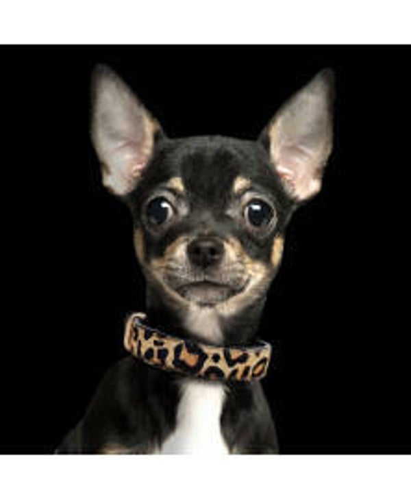 Leren halsband met print - luipaarddesign Zwart lederen voering gouden sluitingen Gouden gegraveerde "M&P" medaille Zwart gewaxte zijkanten
