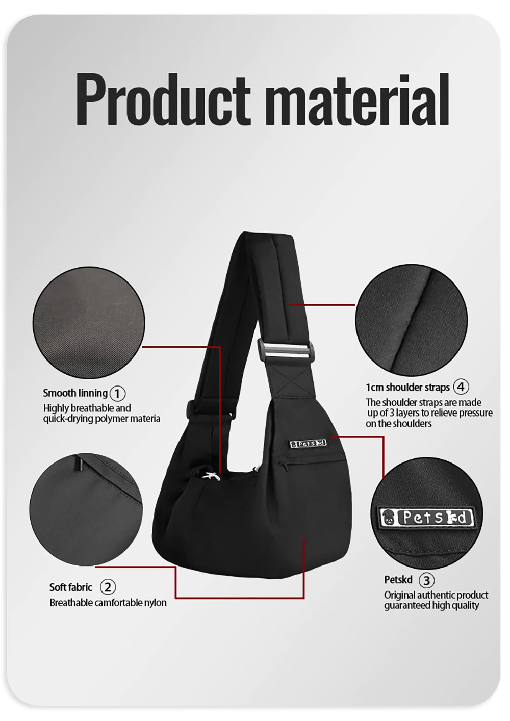 Polyester waterdichte stof, aanpasbare schouderriem met zachte mousse, gsmzakje met rits, aanpasbare gesp om uw Snuffel vast te hechten, zak kan je dichter/kleiner maken dmv knopen